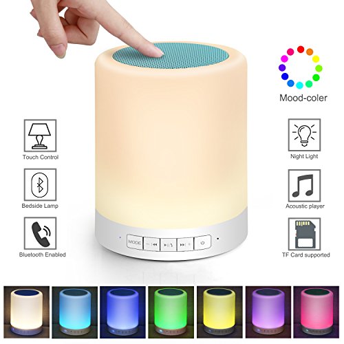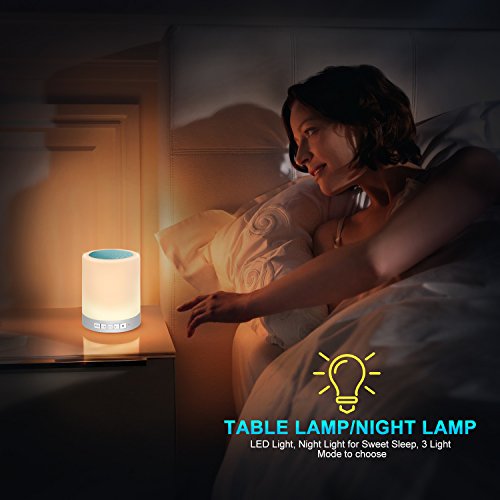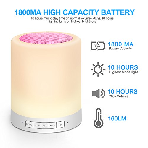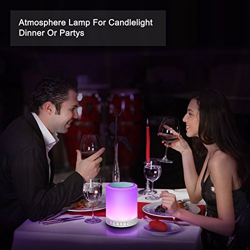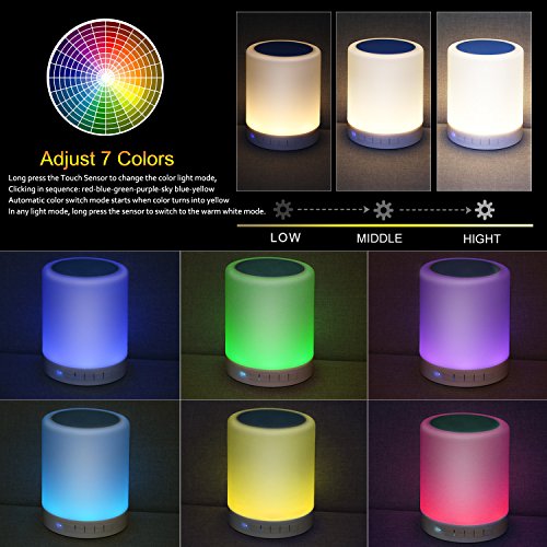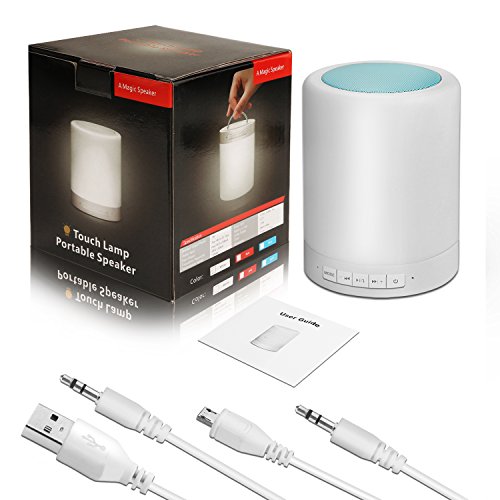 -. Feature : LED BLUETOOTH SPEAKERS BEDSIDE LAMP: This is not just a wireless Bluetooth speaker, but also a stylish LED bedside lamp. Which is a wonderful gift for your families or friends in the daily life or the special days. / DIMMABLE TABLE LAMP SPEAKER: Our LED Bluetooth speaker adopts advanced sensor control technology, makes you easy to turn on/off the light or change the color of this light with just a gentle touch on the top of the speaker. / HIGH CAPABILITY: With built-in 1800mA huge capacity battery, the music playing time of this LED Bluetooth speaker can lasts for about 8-10 hours with just 2.5-4 hours. This rechargeable speaker can be charged via USB cable. / PRACTICAL FUNCTIONS: There are 4 modes of this speaker, Bluetooth mode makes hands-free calling and answering phone calls come true. TF Micro SD card mode supports easy music playing by inserting your SD card directly into the speaker. The AUX mode allows you to easily connect to the speaker via 3.5mm jack music cable if you do not like to use Bluetooth mode. / PORTABLE AND LIGHTWEIGHT: This is a mini wireless Bluetooth speaker, which is convenient and easy to take to outdoor, and it can be hung up or carried by hand. Just enjoy the warm light and music while you are camping, reading or romantic dinner