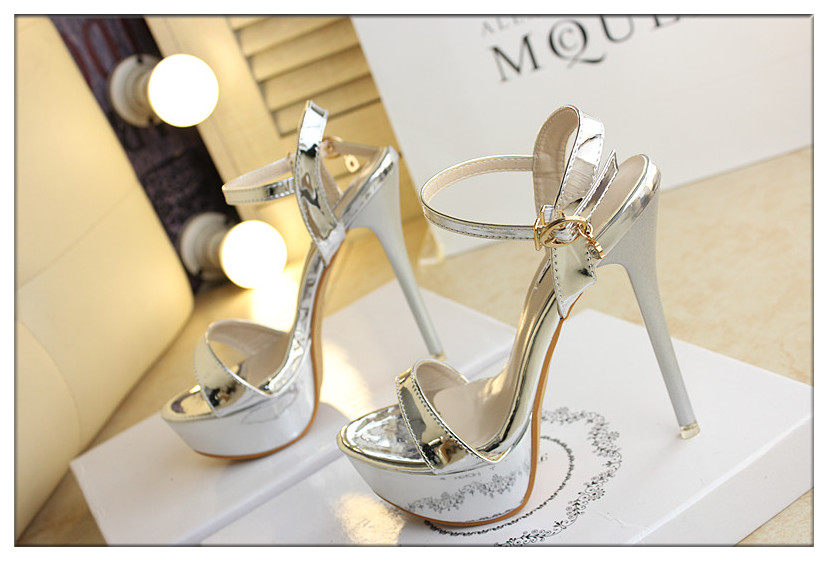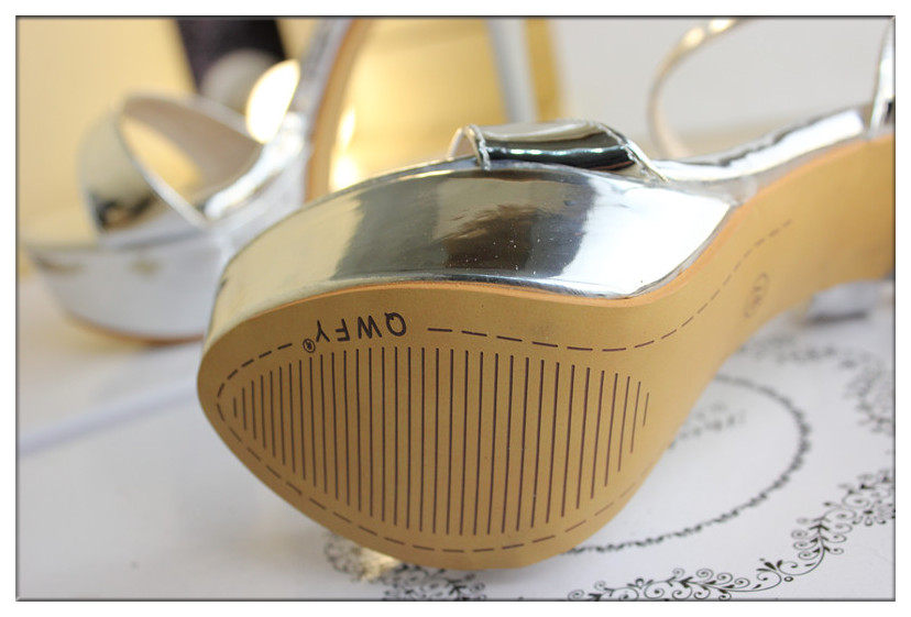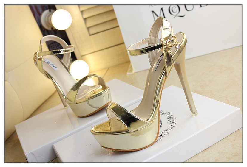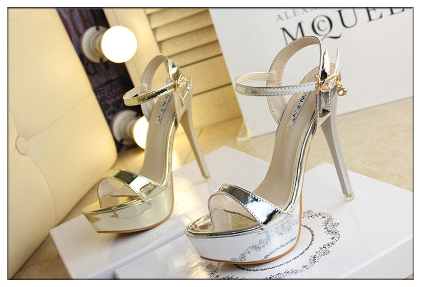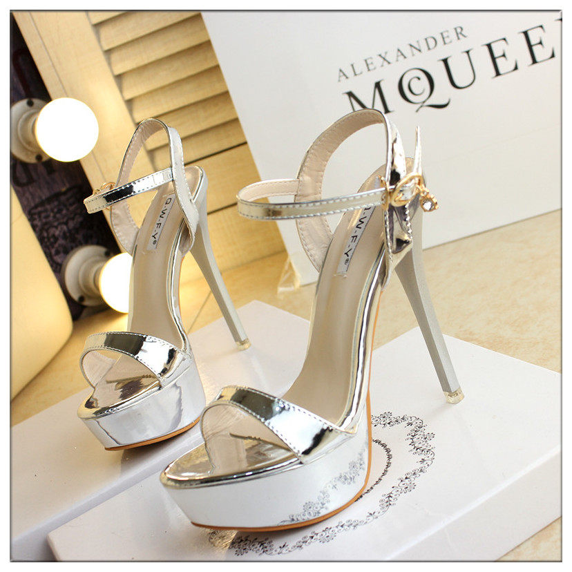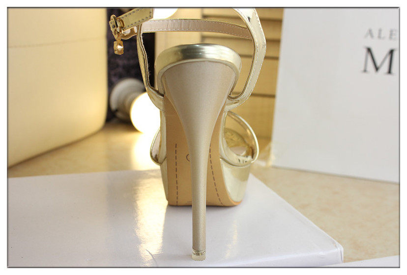 14cm超高跟凉鞋金色漆皮一字细跟防水台银色夜店高跟凉鞋女夏