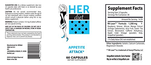 HERdiet's Appetite Attack is the ideal supplement women determined to lose weight. It's a natural way to control your appetite, boost your metabolism and speed up weight loss. Use this in conjunction with a healthy diet and workout regimen.