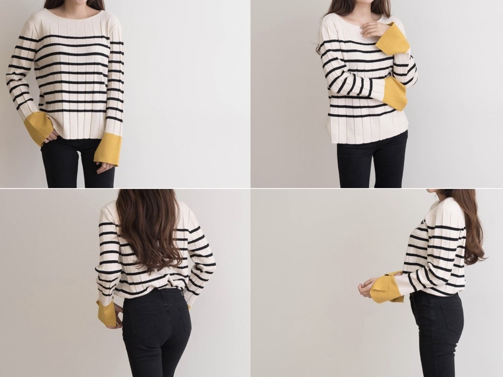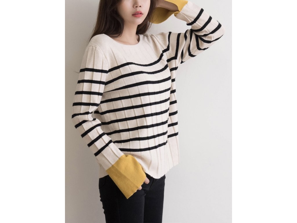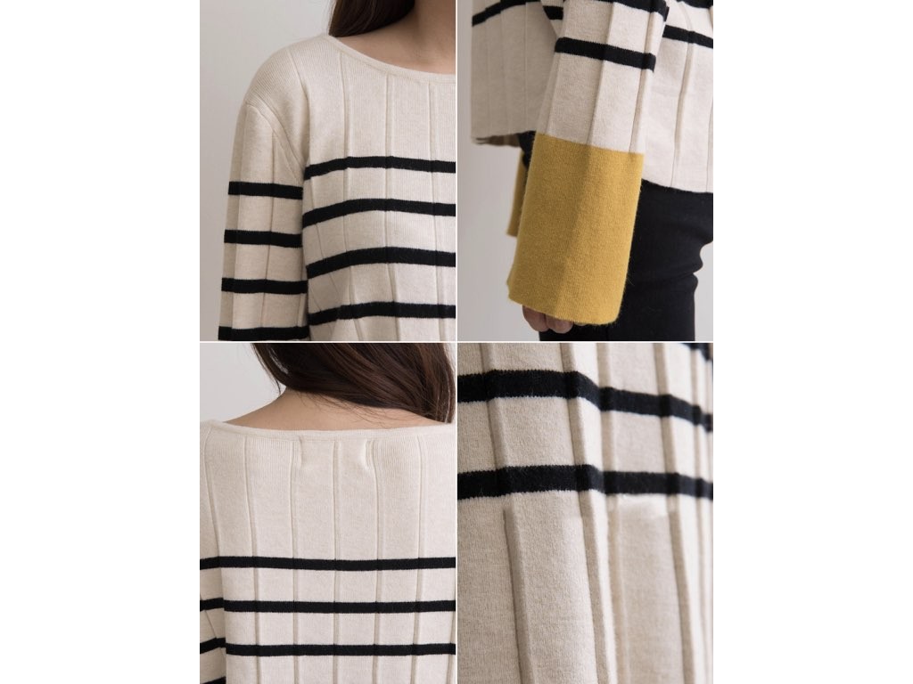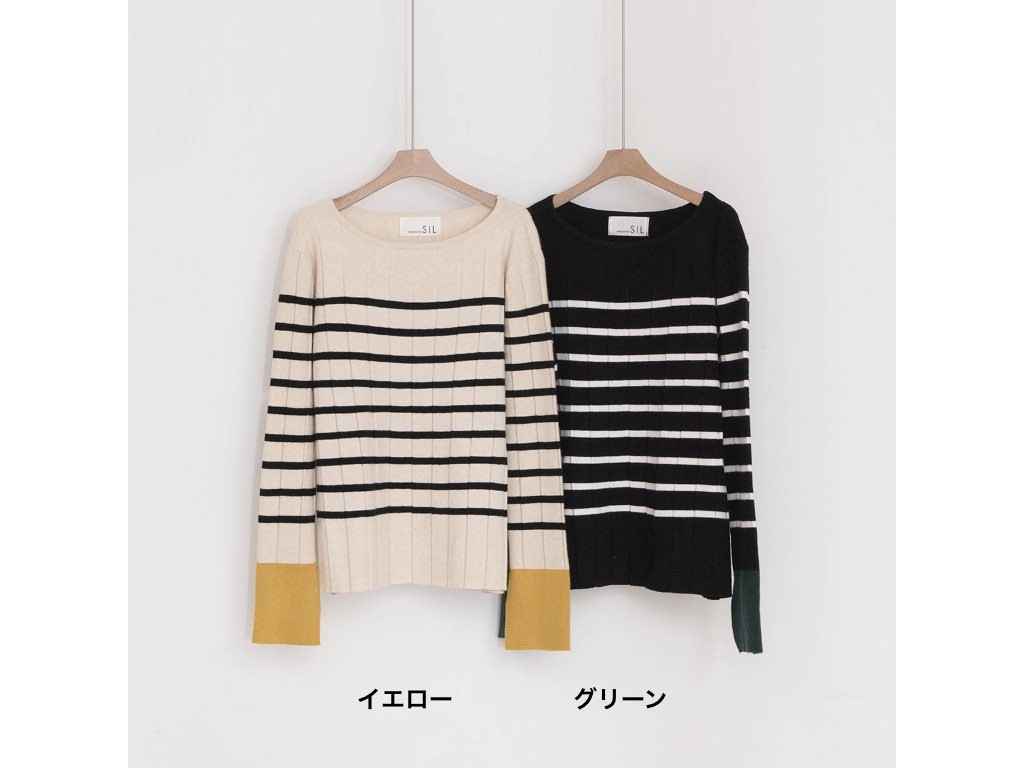 ボーダーのニットです。袖の部分のカラーがワンポイントになります。細部まで、とても丁寧なつくりとなっています。1.基本情報色:2色展開(イエロー/グリーン)サイズ:Free素材:アクリル混紡製造国:korea2.サイズ情報肩幅:42cm 身幅(胸断面):52cm 腕の長さ:62cm 着丈(前):63cm (サイズは計る方法に応じて±2〜3cmの誤差があります。ご了承お願い致します)モデル着用サイズ:F※着用モデル(163cm、体重47kg、足のサイズ24.5cm)3.その他の情報厚み:中間透け感:なし伸縮性:高裏地:なし洗濯方法:ドライ(クリーニング)[注意事項]お取り寄せ商品は、海外より仕入れるため納品まで約10日前後いただきます。また店舗でも販売しており、在庫切れになる場合もございます。ご了承お願い致します。