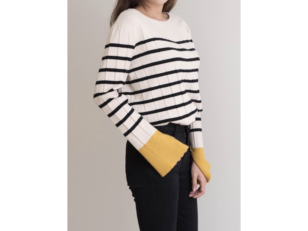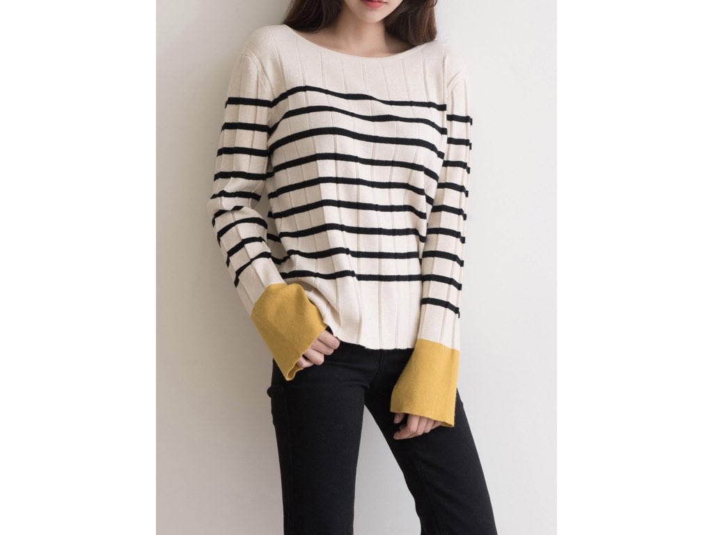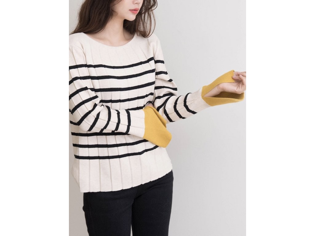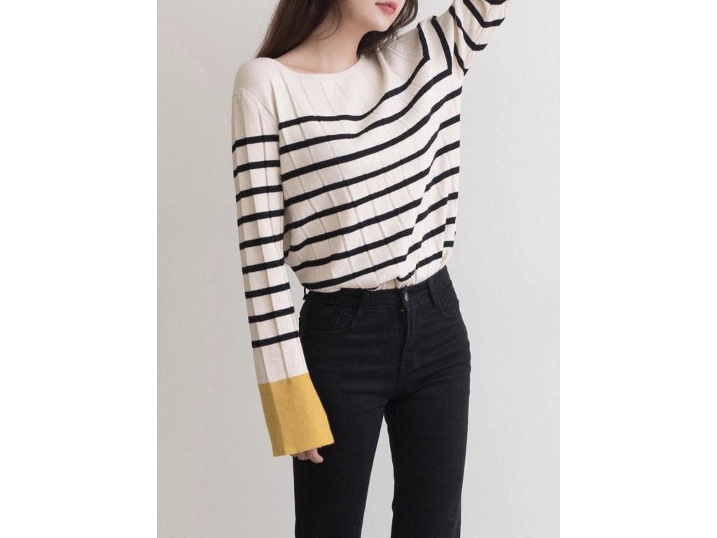 ボーダーのニットです。袖の部分のカラーがワンポイントになります。細部まで、とても丁寧なつくりとなっています。1.基本情報色:2色展開(イエロー/グリーン)サイズ:Free素材:アクリル混紡製造国:korea2.サイズ情報肩幅:42cm 身幅(胸断面):52cm 腕の長さ:62cm 着丈(前):63cm (サイズは計る方法に応じて±2〜3cmの誤差があります。ご了承お願い致します)モデル着用サイズ:F※着用モデル(163cm、体重47kg、足のサイズ24.5cm)3.その他の情報厚み:中間透け感:なし伸縮性:高裏地:なし洗濯方法:ドライ(クリーニング)[注意事項]お取り寄せ商品は、海外より仕入れるため納品まで約10日前後いただきます。また店舗でも販売しており、在庫切れになる場合もございます。ご了承お願い致します。