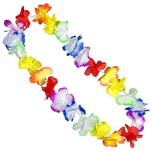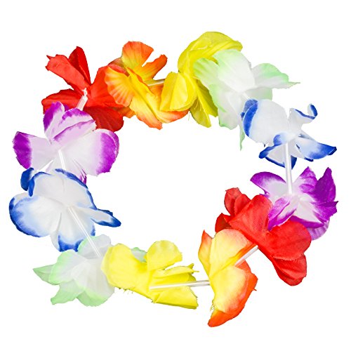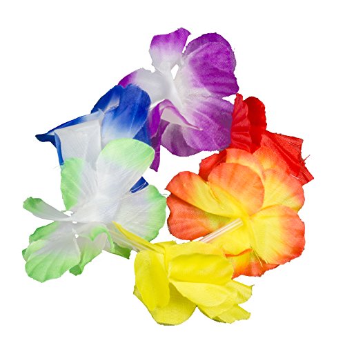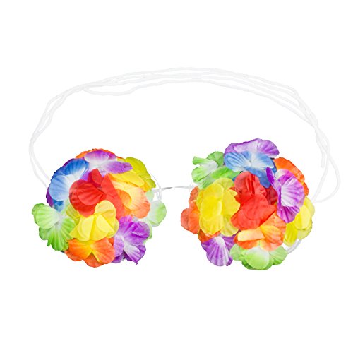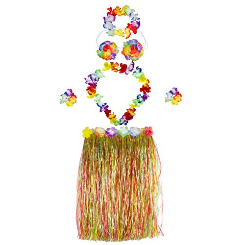 - Each is brand new and individually packaged.Package includes 1 x flower headband, 1x flower necklace, 2 x flower bracelets, 1 x flower Bikini Top,1 x grass skirt.