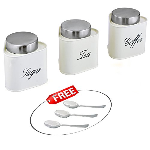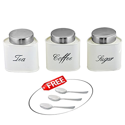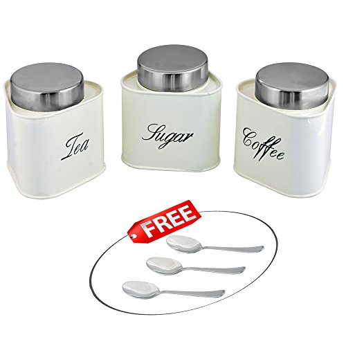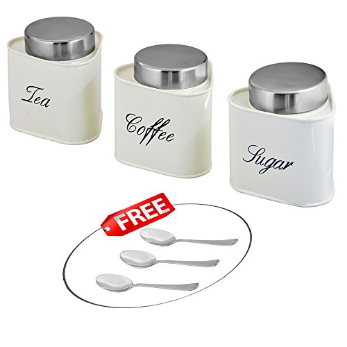 Kosma Set of 3 Tea Coffee Sugar Metal Canister Set (Triangle) with Stainless Steel Lid in vibrant Cream Color - Free 3pc Stainless Steel Tea/Coffee/Sugar Spoon