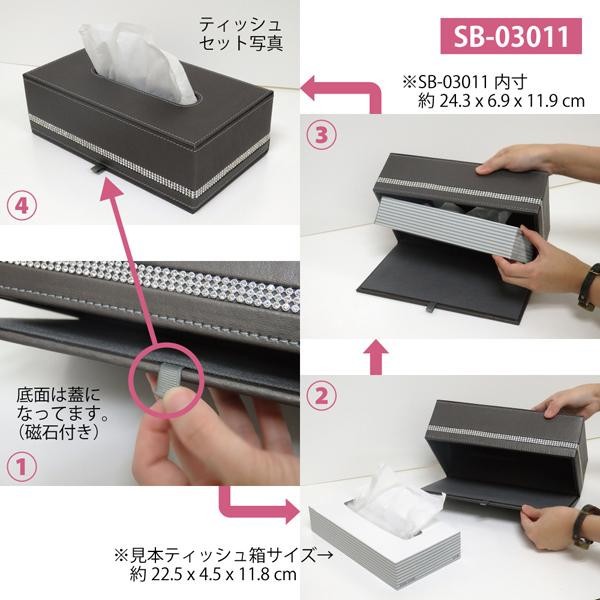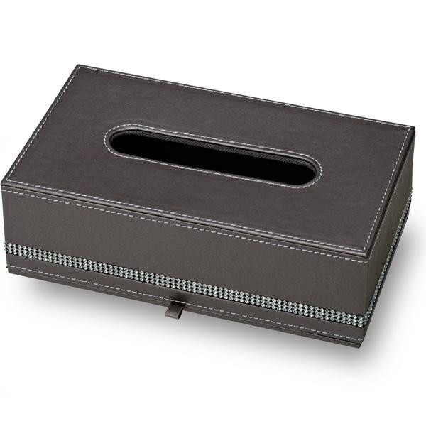 シックなダークグレーのフェイクレザーに、キラキラのラインストーンが引き立つ高級感あふれるティッシュボックスです。