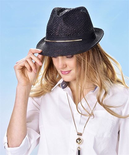 Binding : Apparel Product Description A Must-Have Hat! Black Straw Fedora Hat from the Cayman Apparel Co. features open weave design. The Black Faux-Leather Band features a gold-tube detailing. Custom size adjusting band inside the crown and UV protectant for comfort and care. Polyester. One Size Fits Most. Spot clean with damp cloth. 0