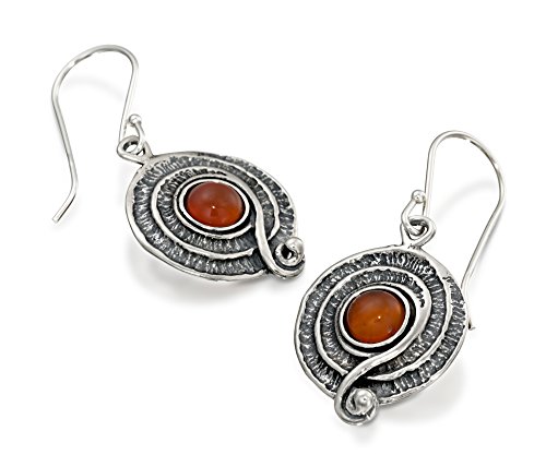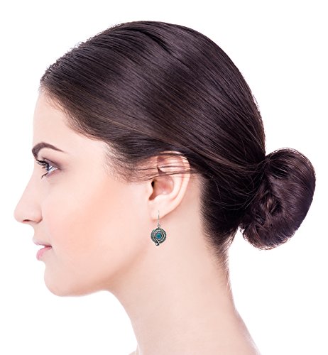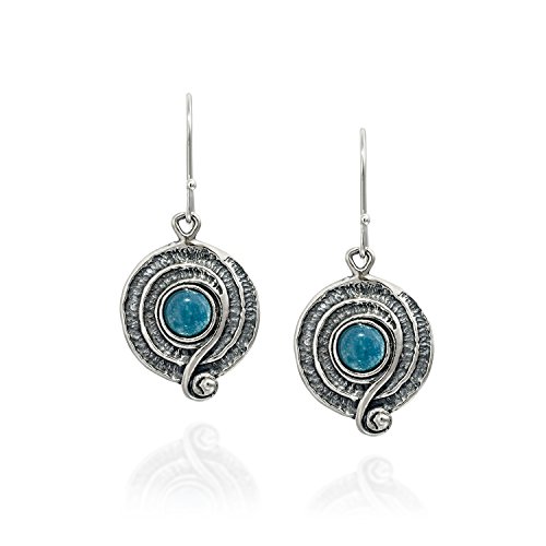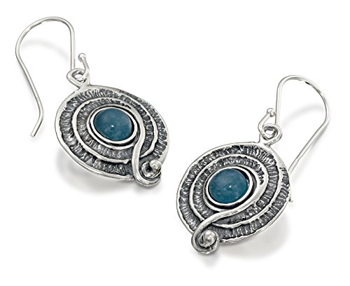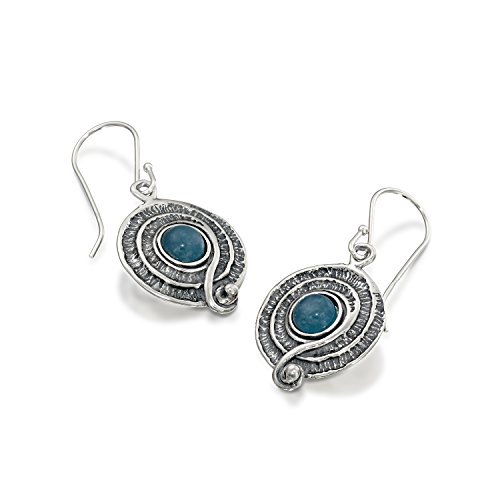 Vintage style blue Quartzite gemstone Sterling Silver dangle earrings. 925 Sterling Silver round swirl dangle earrings with 6 mm round cabochon blue Quartzite gemstone. These elegant earrings measure about 15/16" or 2.4 cm in length excluding the nickel free Sterling Silver French wire hooks. Unique artisan design.