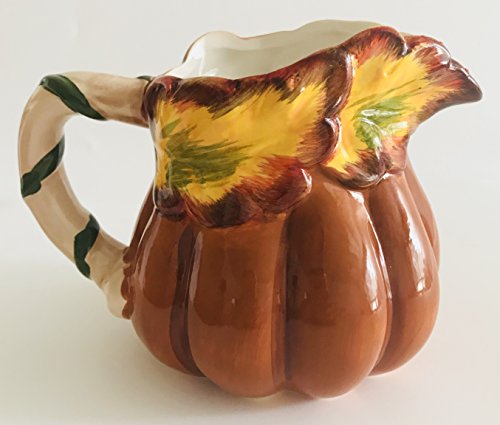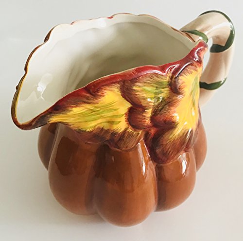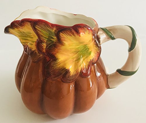 Product Description Delightful Decorative Pumpkin Pitcher | Creamer for Gravy and Coffee Cream. Pitcher Measures 5 inches Tall x 7 inches including the Handle X 5 inches wide. Pitcher Holds About 2 Cups of Gravy Or Coffee Creamer. Painted Pumpkin Orange with Yellow Brown Leaves. See More Pumpkin Items from This Seller. 0