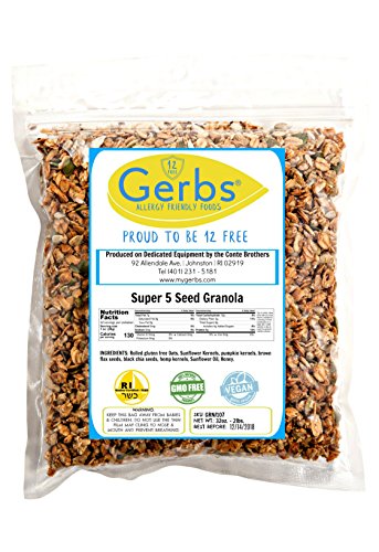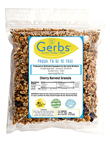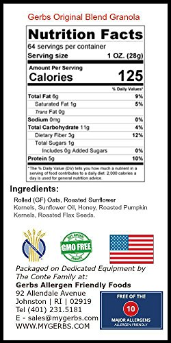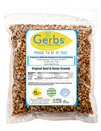 Gerbs Original Blend Granola. Produced on 100% Dedicated Packaging Equipment. This deal includes 4 Pounds of Gerbs Gourmet Granola packaged in premium re-sealable zipper high barrier food grade poly bag yielding an All-Natural shelf life of 1 year without using any chemicals or preservatives. This product is Allergen Free and tested by the CSA, 100% All-Natural/NON-GMO, Vegan, and Kosher. Simply, there is no other Granola lines on the market as fresh as Gerbs, which taste homemade, while also being Allergen Free & Non-GMO. Order some day, have it in the morning with some milk or add it into some Greek Yogurt, we typically ship within 24-48 hours, and then taste what you have been missing!Feature