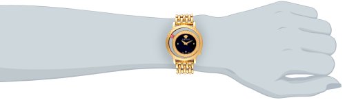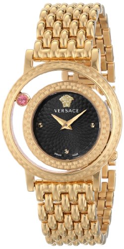 Chic, sleek and attractive, this Versace women's watch is great for everyday wear. Its black patterned dial features a Medusa stud in the 12 position and is surrounded by a gold IP stainless steel guilloche outer ring and top ring. A genuine topaz is set in the see-through bezel, adding to its elegant appearance. Its gold IP stainless steel linked bracelet comfortably closes with a deployment clasp for safe and secure all day wear. Powered by reliable Swiss Quartz movement and water resistant to 30 meters, it is an ideal addition to any timepiece collection.