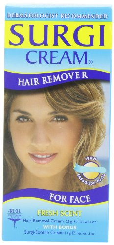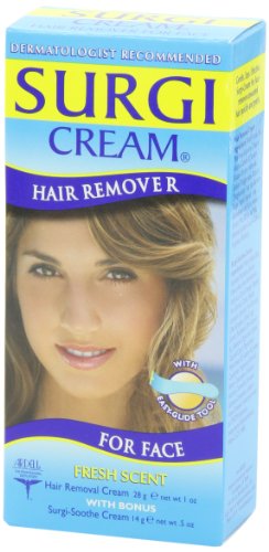 Surgi-Cream for Face is an easy, effective way to remove facial hair. Smooth Hair Remover Cream on upper lip area, cheeks and/or chin, relax for a few minutes and rinse away. Product works in as little as 4 minutes. Formula now features Maple Honey, Known for helping skin retain moisture. With Surgi-Cream, the hari removal process is even more kind and gentle on the delicate skin of your face. As our bonus to you, we have included a Free tube of Surgi-Soothe Cream with Hair Stop Plus TM. Hair Stop Plus TM contains extracts of papaya, citrus and olive to naturally minimize the appearance of new hair growth. Pro-Vitamin B2 and Aloe Vera calm, soothe and moisturize.Feature