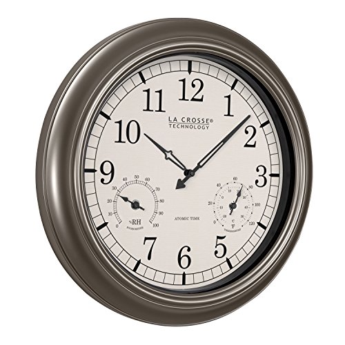 Keep track of time with the utmost precision while working in the garden, splashing in the pool, or barbecuing on the patio with this 18-inch outdoor atomic wall clock from La Crosse Technology. Radio-controlled by the national atomic clock in Colorado, the clock resets daily to the hour, minute, and second for continued accuracy. Additionally, the clock adjusts automatically for daylight savings time. Equipped with a thermometer and a hygrometer, the clock also assesses and relates temperature and humidity levels to help users protect seedlings from frost, avoid over-watering finicky plants, and take precautions against an icy walkway. Surrounded by a sleek silver-painted plastic frame, the clock face features black 1-1/6-inch-high numbers for easy visibility. Elegant, black metal hands tick off the hours and minutes. For temperature and humidity readings, the clock face displays two small analog gauges. The hygrometer gauge measures from 1 to 99 percent relative humidity, while the temperature gauge gives readings for temperatures from -10 to +130 degrees Fahrenheit, or -30 to +60 degrees Celsius. On the backside of the clock, the user selects the appropriate US time zone; the clock accommodates Eastern, Central, Mountain, and Pacific times. A manual reset button is provided. To ensure accurate readings, hang the clock in a dry area out of direct sunlight. This clock requires the separate purchase of one AA battery for operation. A one-year limited warranty covers this item. The clock measures 18 inches wide by 2-1/2 inches deep by 18 inches high and weighs near 6 pounds upon shipping.