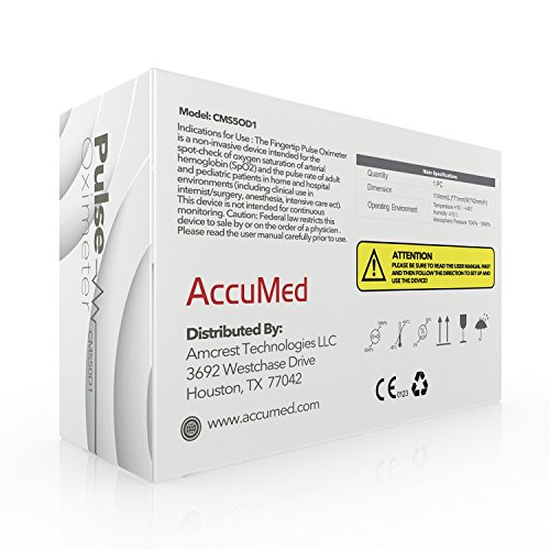 -. Brand : AccuMed -. Color : Blue -. EAN : 0641378487262 -. Feature : AccuMed's digital LED display with low power consumption plus auto-power off feature allows for 40 continuous hours of battery life. / Cover against ambient light offers superior ease of reading. Fast and accurate SpO2 and pulse measurements. / Accommodates pediatric to adult finger sizes and can be used by sports and exercise enthusiasts as well as anyone interested in measuring pulse rate and oxygen saturation. / Includes 2 AAA batteries, lanyard, and convenient carrying case. / Guaranteed by 1 US year warranty offered exclusively by AccuMed. -. IsAdultProduct : 0 -. IsAutographed : 0 -. IsMemorabilia : 0 -. Label : AccuMed -. Manufacturer : AccuMed -. MPN : CMS50D1-Blue -. PackageQuantity : 1 -. PartNumber : CMS50D1-Blue -. ProductGroup : Sports -. ProductTypeName : PROFESSIONAL_HEALTHCARE -. Publisher : AccuMed -. Size : CMS-50D1 -. Studio : AccuMed -. Title : AccuMed® CMS-50D1 Pulse Oximeter Finger Pulse Blood Oxygen SpO2 Monitor w/ Carrying case, Landyard & Battery FDA CE Approved (Blue) -. UPC : 641378487262