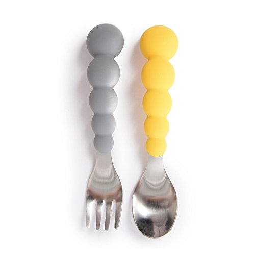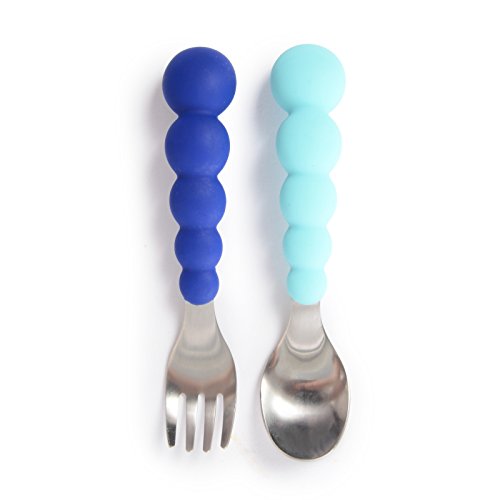 Product Description CB EAT 100% Silicone Stainless Steel Flatware Set encourages self-feeding and builds self-confidence and independence. The Curved ergonomic silicone beaded handles are designed for young hands to hold. Fork tines are effective and spoon shape makes it easy to scoop liquid for an overall positive self-feeding experience for your child.