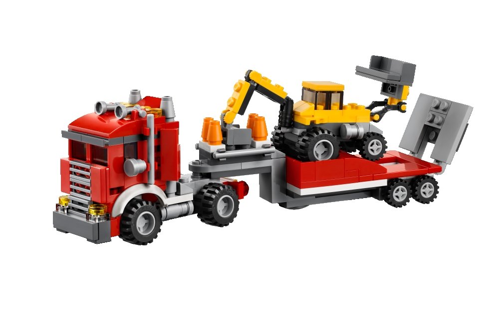 Construction carriers will head to heavy work today! Once you set up a cone, prepare the excavator by lowering the ramp! Move the front bucket and backhoe of the excavator to get to work.