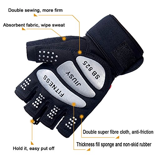 -. Feature : Original Gym gloves are sold by JIUSY only. Professional fitness gloves,Please select us. / Stretch mesh fabric is comfortable, quick-drying, breathable and prevents heat buildup in the gloves which allows prolonged use even during the hardest workouts. / Silicone rubber beading on the glove palm provides a high traction surface to grab a barbell, dumbbell, or other piece of equipment and hold it securely without losing grip. This provides a much better grip than traditional leather palm gloves. / These are the best weightlifting gloves to strengthen your body while protecting your hands from calluses and blisters. They are also very robust and durable, and provides superior cushioning on the palm side, so you can grip with confidence. / Additionally, these gym workout gloves are lightweight and the 21 inchs premium stretch wrist wraps hold the gloves securely in place so when you bend your wrists, the strap will stay in place.It is suitable for Weight Lifting, Bodybuilding, Workout, Strength Training, Crossfit Training, Cross Training, Dumbbell, Barbell etc.