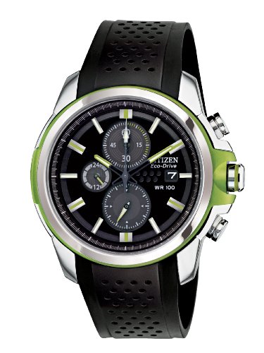 -. Feature : Eco-drive is fueled by light so it never needs a battery / Silver tone stainless steel case with green accents and black polyurethane strap / 1/5 second chronograph measures up to 60 minutes, 12/24 hour time / ProP.R.Ietary chroma finishing / Water resistant to 330 feet (100 M): suitable for snorkeling, as well as swimming, but not diving