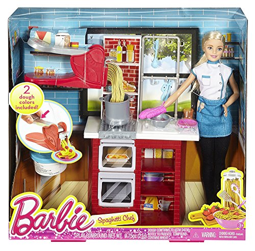 -. Binding : Toy -. Brand : Barbie -. EAN : 0887961274356 -. Feature : Get cooking with this Barbie play set designed for serving up spaghetti dinners! / Barbie doll will heat up the kitchen in a chef-inspired top with blue apron detail, black pants, blue shoes and an oven mitt / Young chefs can create spaghetti noodles and meatballs with dough using the pasta-making tool and roll meatballs with the second color for added fun / Prep the tool by inserting the pasta cutout into the tool's slots and inserting the selected color dough into the compartment within the tool / Press the tool lever down to push dough through to form spaghetti noodles -. HazardousMaterialType : Unknown -. IsAdultProduct : 0 -. Label : Mattel -. Manufacturer : Mattel -. Model : DMC36 -. MPN : DMC36 -. PackageQuantity : 1 -. PartNumber : DMC36 -. ProductGroup : Toy -. ProductTypeName : TOYS_AND_GAMES -. Publisher : Mattel -. Studio : Mattel -. Title : Barbie Spaghetti Chef Doll & Playset -. UPC : 887961274356 -. Warranty : 1 year warranty against manufacturer defects