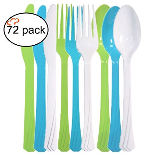 Tiger Chef 72-Pack Plastic Cutlery Set Heavy Duty Colored Plastic Silverware Set includes 24 Forks, 24 Teaspoons, and 24 Knives in Lime Green, Island Blue and Pearl…