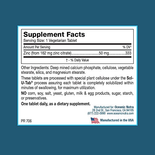 Zinc is a powerful natural supplement that assists many of your body's systems to keep them balanced and functioning properly. Zinc offers a strong immune boost and antioxidants to keep radicals in check. The boost in metabolism you see will help increase energy. It aids in the metabolism of melatonin, which helps improve your sleep, focus, cognition, mood and brain health. Zinc is also good for your cardio and Zinc is key to mens prostate health. Our natural formulation manufactured in the USA is also 100% Corn-free, Soy-free, Gluten-free, Dairy-free, Sugar-free, and Preservative-free. Manufactured in a GMP certified facility and FDA registered facility, Oceanic Nutra Zinc you can take confidently, knowing you will be receiving the best ingredients possible carefully made under strict guidelines for quality, safety, and purity.Feature