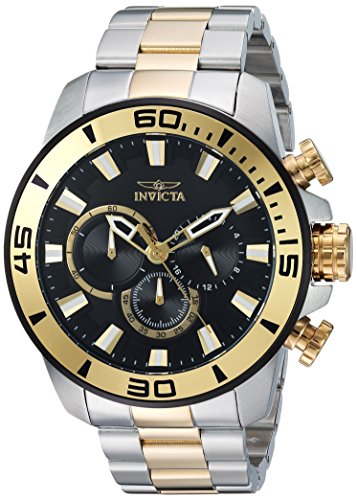 Invicta 22588 Pro Diver chronograph men's watch features a 49mm wide and 13mm thick two tone yellow gold plated solid stainless steel case with a black aluminum ring accented fixed bezel and textured push-pull crown with function pushers. Invicta 22588 is powered by Japanese TMI VD54 quartz chronograph movement. This stylish watch also features a textured black dial with white accents gold tone luminous skeleton hands and index hour markers along with the chronograph and 12/24-hour time display functions, scratch resistant flame fusion crystal and water resistant to 100 meters. Invicta 22588 is equipped with a 24mm wide two tone yellow gold plated solid stainless steel bracelet with a fold over safety lock clasp. Invicta 22588 men's Pro Diver black dial two tone yellow steel bracelet chronograph watch is brand new and comes in an original Invicta gift box and is backed by a 5 year limited warranty.Feature