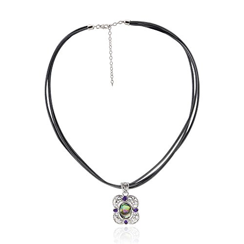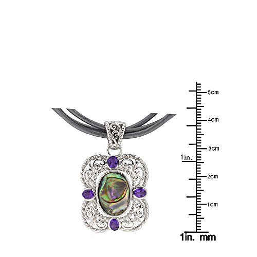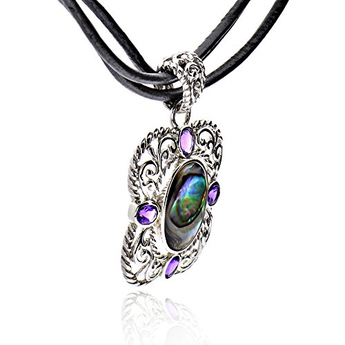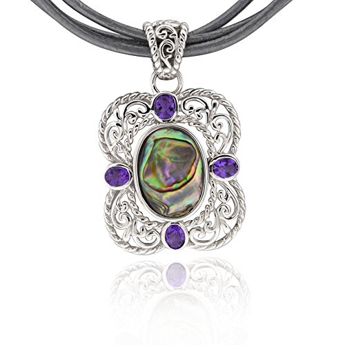 -. Feature : .925 Sterling Silver Rhodium Plated / Charming Pendant 39.9x26.2mm / Include 18" Leather Cord & 3" Extension / Oval Abalone Shell Main Stone 16x12mm and Four Oval African Amethyst Accent Stones / Free Gift Box