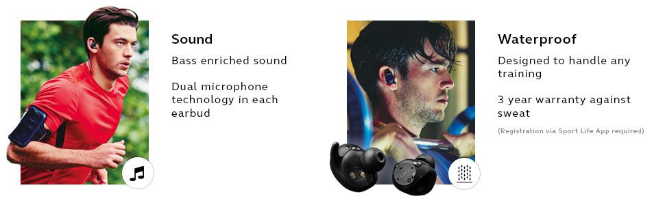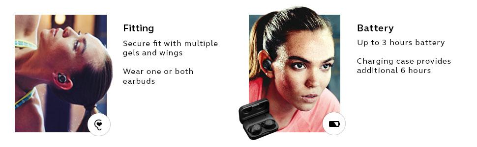 Jabra Elite Sport wireless earbuds feature advanced wireless connectivity, superior sound and call quality, and up to 3 hours talk/music time in the headset + additional 6 hours battery charge in portable charging case. With customizable fitting options, the cord-free earbuds stay securely in place and you have the option to wear one or both buds depending on your activity. The in-ear precision heart rate monitor works with our integrated Jabra Sport Life app to track and analyze your fitness, as well as provide personalized audio . The waterproof design comes with a 3-year warranty against sweat.