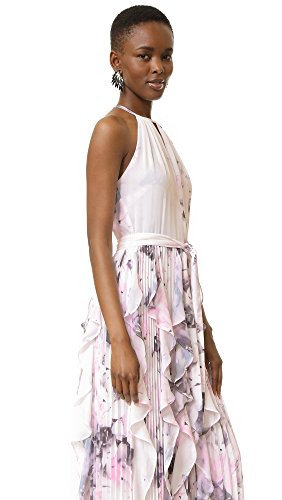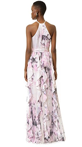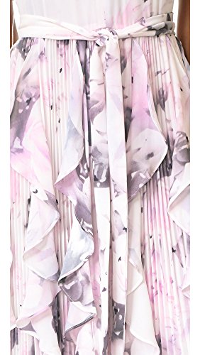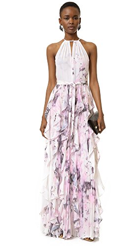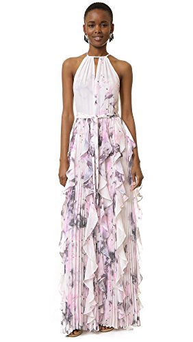 Watercolor prints accent this full-length Parker dress. Slim straps trace the shoulders and keyhole neckline. Dense pleats lend soft volume to the skirt. Hidden back zip. Lined.