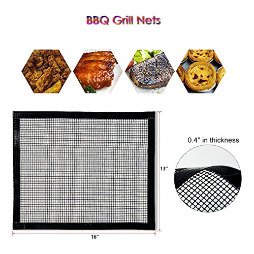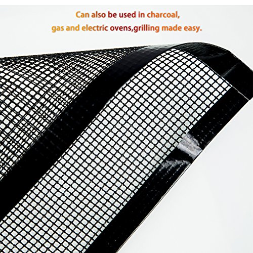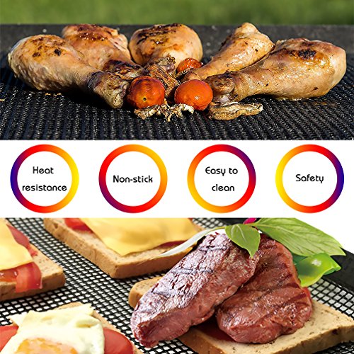- 🍢100% NON-STICK - Our BBQ grill mats are coated with PTFE, which is very smooth and not sticky to food. Replace the traditional oil paper. 100% Non-Stick means you can grill without grease and mats are reusable for years! A box contains 5 pieces of grill mats to enrich your kitchen and outdoor activities.