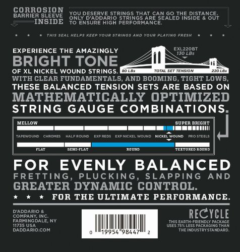 D'Addario EXL220BT Nickel Wound Bass Guitar Strings, Balanced Tension Super Light, 40-95