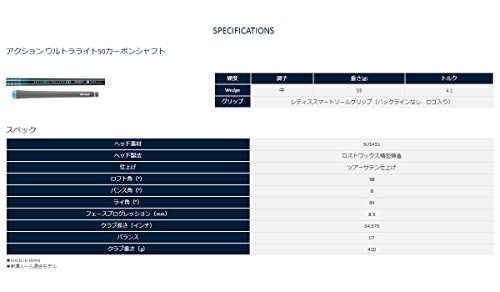 * 헤드 소재:SUS431* 헤드 제법:로스트 왁스 정밀 주조* 마무리:투어 새틴 마무리* 로프트각(°):58* advanced각(°):8* 라이각(°):64* 페이스 프로그레《숀》(mm):8.5* 클럽 길이(인치):34.375* 밸런스:C7* 클럽 무게(g):410* 샤프트:액션 울트라 라이트50카본 샤프트 컨디션:중 무게(g):55 토크:4.1* 그립:레이디스 스마트 솔 그립(백 라인 없음,로고 들어감)* MADE IN JAPAN* 신거우 룰 적합 모델