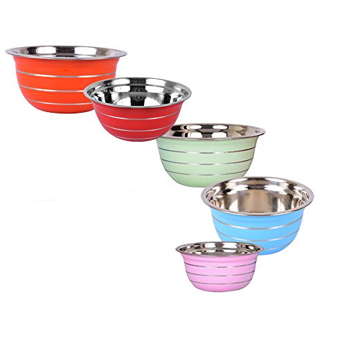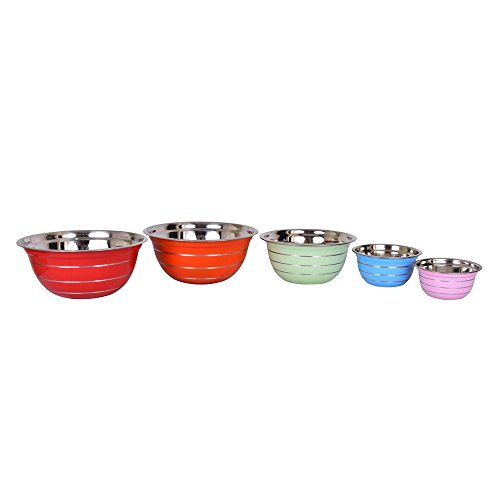- Excellent Value - Set of 5 colour coded stainless steel mixing bowls in sizes: ( 14cm Pink, 16cm Blue, 20cm Red, 24cm Green, 28cm Orange) - Capacity: 0.75 Litre, 1 Litre, 2 Litre, 4 Litre, 6 Litre
