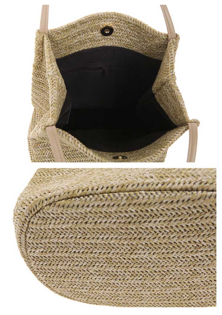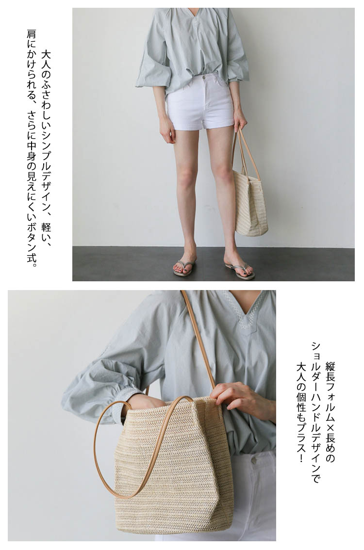 | 春夏のマストitem「かごバッグ」。大人のふさわしいシンプルデザイン、軽い、肩にかけられる、さらに中身の見えにくいボタン式。縦長フォルム×長めのショルダーハンドルデザインで大人の個性もプラス!肩がけが楽にできるところも嬉しいpointです。 | |