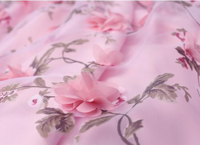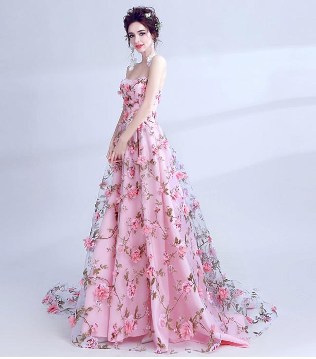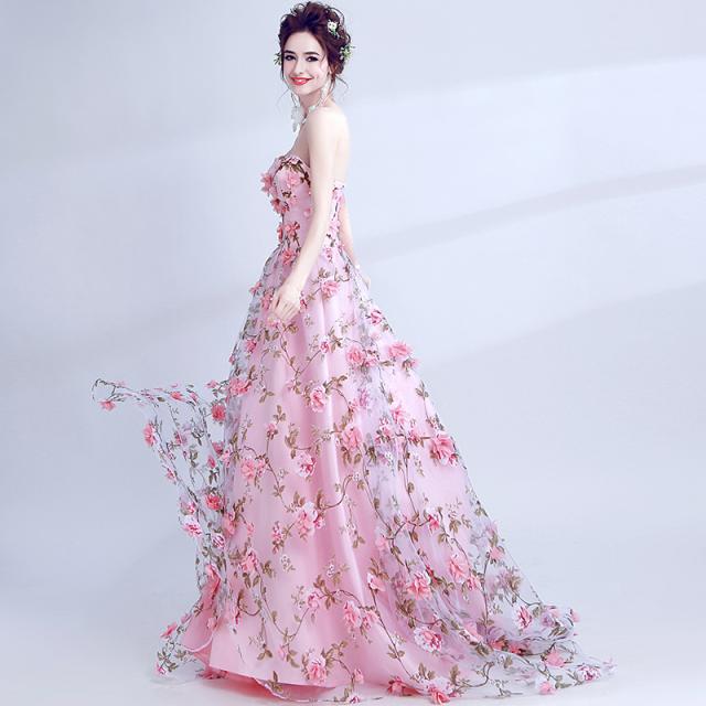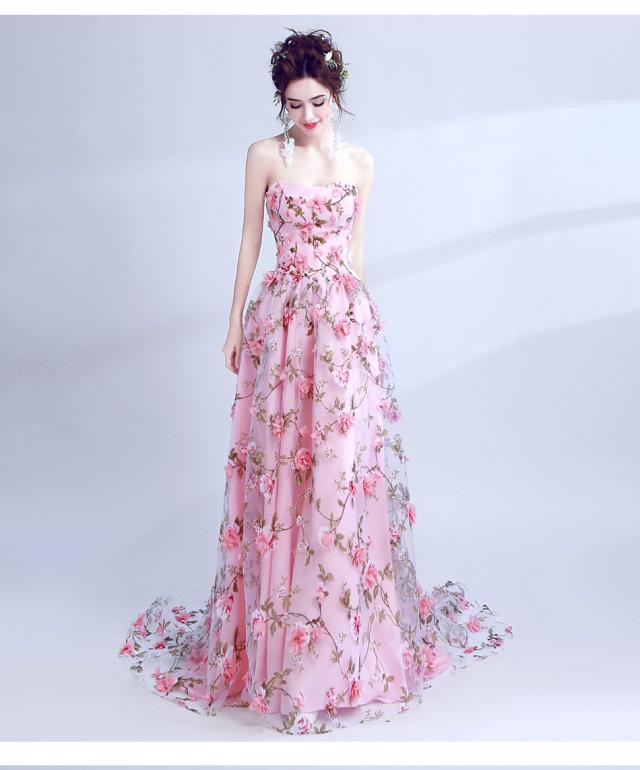 ロマンティックで華やかなベビーピンクのAラインロングドレス