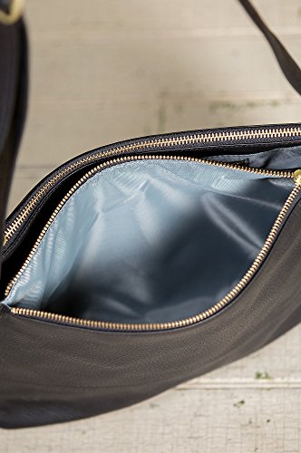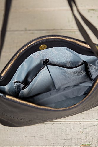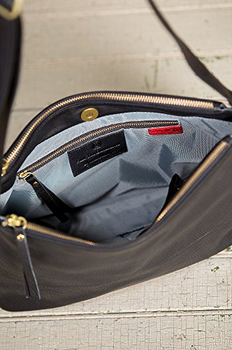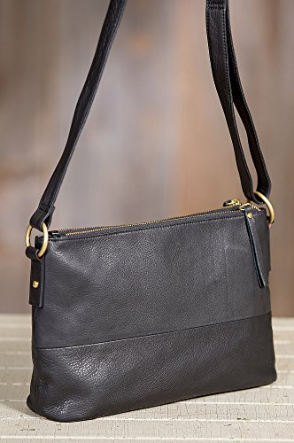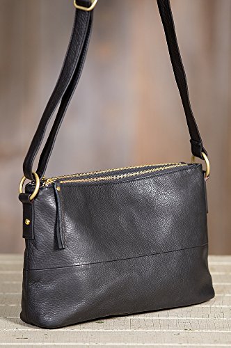-. Feature : Full width top zip compartment at the front and back of this great looking handbag / Open storage in between to hold your cell phone, keys, cosmetics, wallet, with room to spare / The main front compartment includes a zip wall pocket with RFID lining, two slip pockets / Beautifully fashioned of Argentine cowhide leather with a supple feel. Adjustable strap / Lining: 420 D Nylon. Strap Drop: 23". Dimensions: 12"W x 8"H x 3.5"D. Made in China.