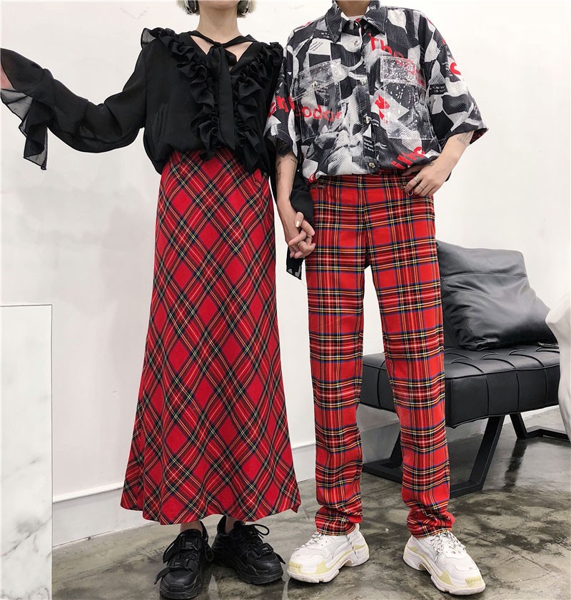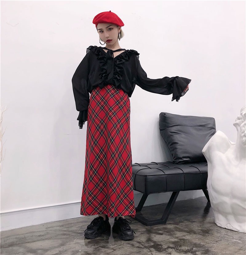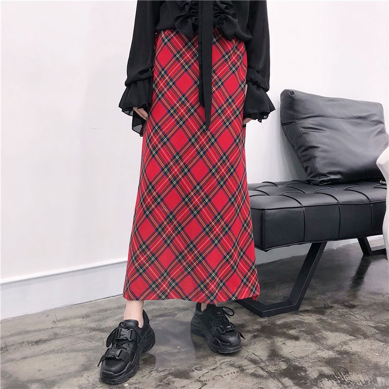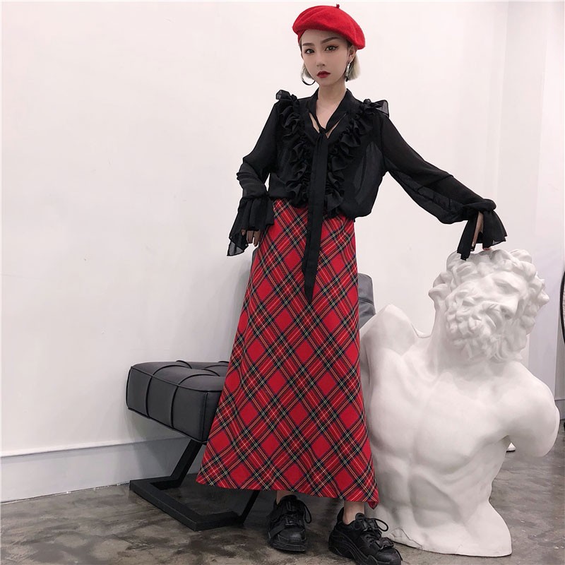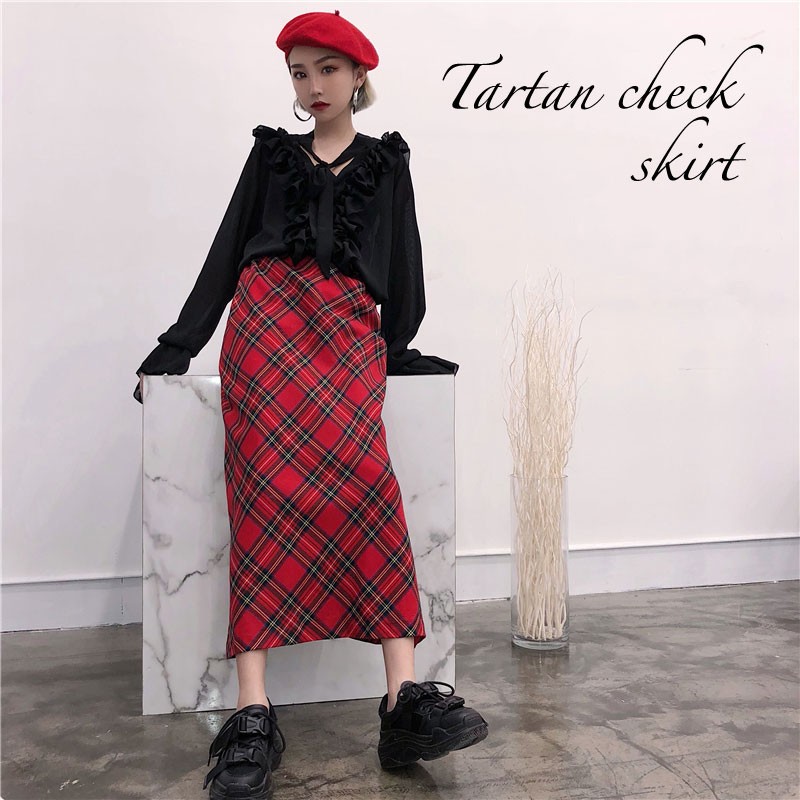 レトロであたらしい赤のタータンチェックのロングフレアスカート♪