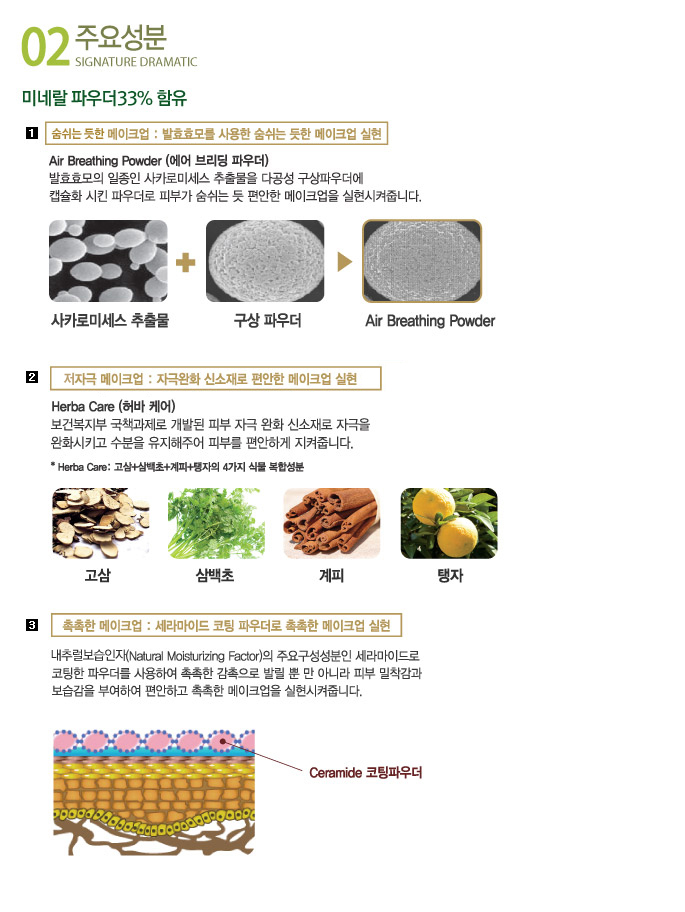 様々な屈折率を持つパウダーと、様々なサイズの微粒子複合パウダーが肌のトーンを均一にカバーしてくれるし、反射率が高いカラートリミングパウダーを配合して肌を明るくつややかに表現 刺激緩和の新素材ホバケオ成分を
