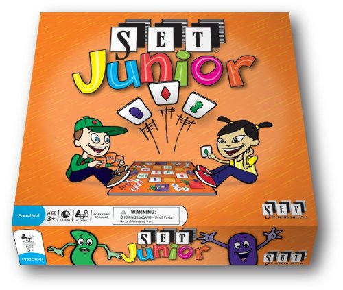 -. Binding : Toy -. Brand : SET Enterprises -. EAN : 0789264033718 -. Feature : • Ages 3 and up. 2-4 Players. / • Thick cards designed for little fingers. / • All the fun of the original game for younger players! -. Genre : strategy -. IsAdultProduct : 0 -. ItemPartNumber : SET1300 -. Label : Flat River Group -. Manufacturer : Flat River Group -. Model : SET 1300 -. MPN : SET1300 -. PackageQuantity : 1 -. PartNumber : SET1300 -. ProductGroup : Toy -. ProductTypeName : TOYS_AND_GAMES -. Publisher : Flat River Group -. SKU : 85826A7E -. Studio : Flat River Group -. Title : SET Junior: Your very first SET game! -. UPC : 736396013002 -. Warranty : No Warranty