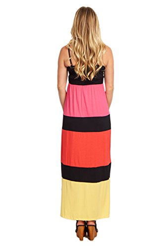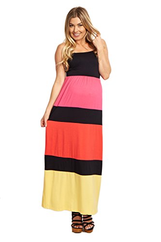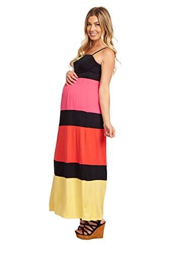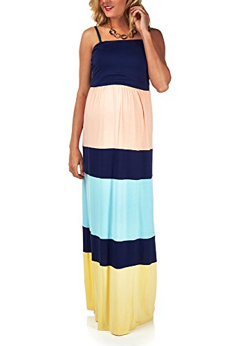 A colorblock maxi maternity dress. Cinched under bust. Rounded neckline. Adjustable straps.