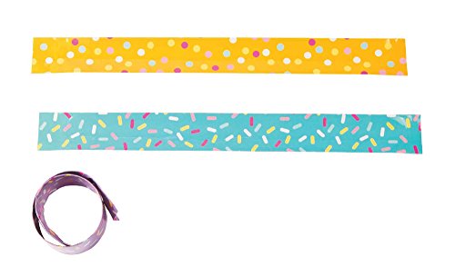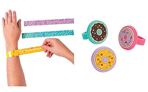 [Donut Party Rings]. These delicious party favors are an excellent addition to your donut party supplies! Perfect for your treat bags or game prizes, these delectable delights will go great with the rest of your donut party decorations. Features an assortment of teal, pink and purple with colorful sprinkled donuts on top. Rubber. [Donut Slap Bracelets]. A sweet accessory in an instant! Slap this bracelet on your arm and watch it surround your wrist with its sweet sprinkles design. Drop these interactive accessories in your Donut Party favor bags or hand them out as giveaways or incentives. More Donut Party supplies are waiting for your sweet celebration on our site! Metal. 9 1/2" x 1"Feature