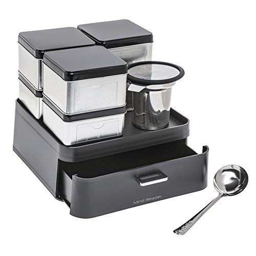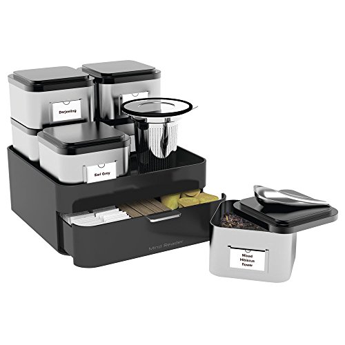 Studio : EMS MIND READER Publisher : EMS MIND READER Product Description This attractive loose leaf tea storage set features 6 tea caddies with silicone lids that provide airtight storage. It includes a fine mesh stainless steel tea infuser with a matching lid to hold brewing temperature. The lid can be used as an infuser rest when the tea is done brewing. A glossy black ABS plastic tray keeps the caddies organized, and it has a shallow drawer to store other tea brewing accessories. 9 1/4" x 8 3/8" x 10" (W x D x H). 0