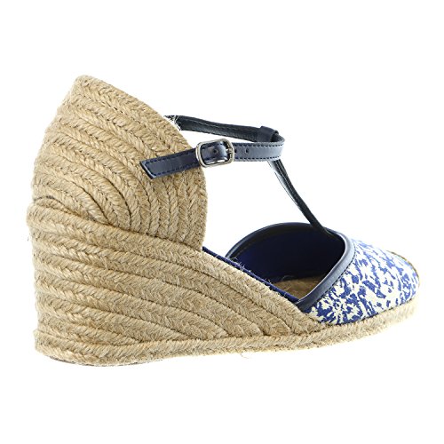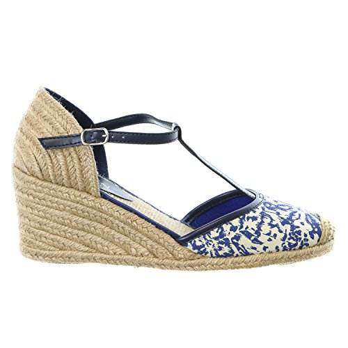 Round-toe espadrille in T-strap design featuring jute-wrapped wedge and heel counter
