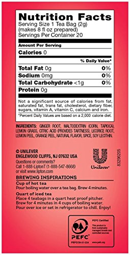 -. Binding : Grocery -. Brand : Lipton -. Feature : Uplifting when enjoyed hot or refreshing when enjoyed as an iced tea. / Conveniently packaged in 20 individually wrapped tea bags, Lipton Lemon Ginger Herbal Tea delivers the lively and tangy taste of fruit that is naturally caffeine free. / Cup of Hot Tea: Pour boiling water over a tea bag and brew 2 to 3 minutes. Stir in milk if desired and sweeten to taste. -. IsAdultProduct : 0 -. Label : Unilever -. Manufacturer : Unilever -. NumberOfItems : 6 -. PackageQuantity : 6 -. ProductGroup : Grocery -. ProductTypeName : GROCERY -. PublicationDate : 2015-11-10 -. Publisher : Unilever -. ReleaseDate : 2015-11-10 -. Studio : Unilever -. Title : Lipton Herbal Tea, Lemon Ginger, 20 Count (Pack of 6)
