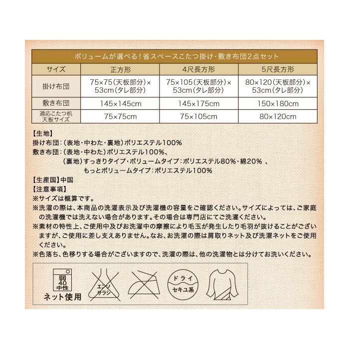 원본상품명:洗える 5尺長方形 *040703276 省スペ?ス こたつ布?セット ボリュ?ムタイプ マイクロファイバ? ボリュ?ムが選べる 適?こたつ机天板サイズ:80×120cm マイクロファイバ?省スペ?スこたつ掛け 敷き布?2点セット ボリュ?ムタイプ 5尺長方形 040703276