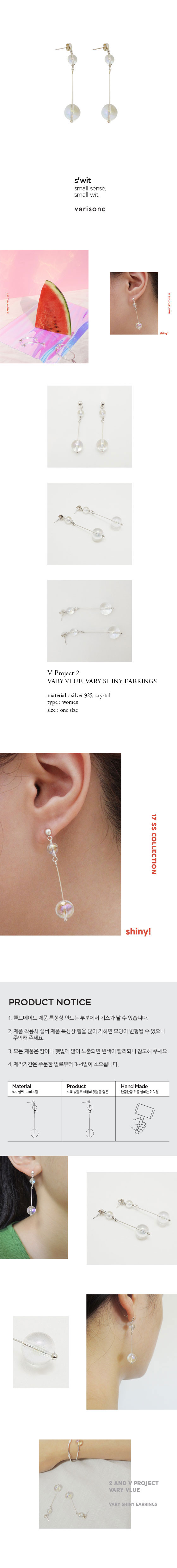 오색 빛깔로 부숴지는 여름의 햇살을 담은 VARY SHINY 이어링입니다. 홀로그램 컬러 코팅된 크리스탈이 착용하는 사람에 따라 다양한 컬러로 보여지는 유니크한 제품입니다.
