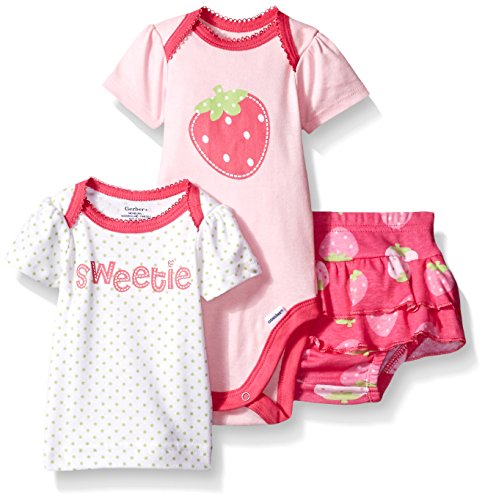 -. Binding : Apparel -. Brand : Gerber -. Department : baby-girls -. Feature : Designed for easy on-off dressing / Snaps at bottom for quick changing / Gentle elastic waistband for comfort / Screen-print and pocket details -. Label : Gerber Children's Apparel -. Manufacturer : Gerber Children's Apparel -. Model : 89502316A -. PackageQuantity : 1 -. ProductGroup : Apparel -. ProductTypeName : SKIRT -. Publisher : Gerber Children's Apparel -. Studio : Gerber Children's Apparel -. Title : Gerber Baby Girls Three-Piece Bodysuit Lap-Shoulder Shirt and Skort Set Gerber newborn baby girl 3-piece bodysuit, shirt and skirt set is the perfect warm weather outfit for outdoors or staying inside with baby. Coordinating shirt and bodysuit with matching pull-on skirt makes two sweet outfits for one value price. Lap shoulder necklines and snap closure on bodysuit mean easy on-off dressing, while skorts feature a comfortable elastic waistband. Ideal for gift giving