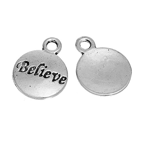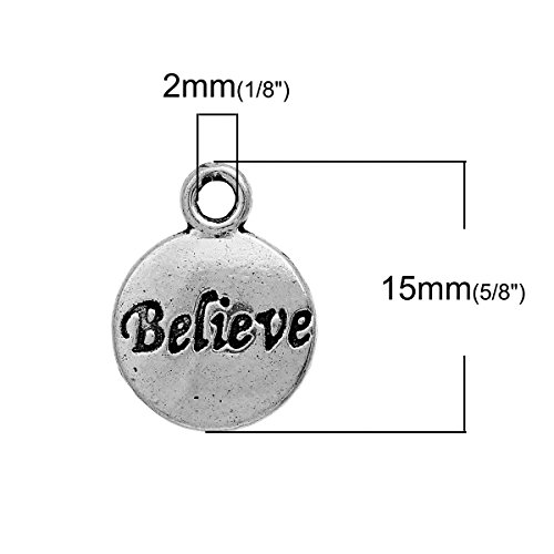 50 Antique Silver Circle Round Believe Word Charm with Ring 15 x 12mm