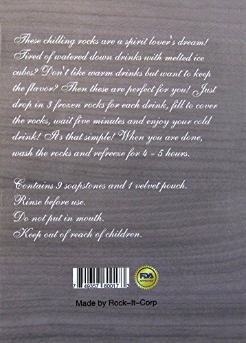 -. Brand : Rockit -. Color : Gray -. EAN : 0749357600173 -. Feature : The Soapstones are made of 100% soapstone build, which is perfectly safe for your drinks. / Keep your whiskey chilled up to 8-15 degrees without diluting the taste. / Unlike ice cubes, the whiskey stones are reusable, so they last forever. The pack contains 9 Soapstone cubes, which are enough to serve as many people. / The chilling rocks are soft and do not scratch your glass. / It comes in a beautiful package; makes the perfect gift! Also backed by a hassle-free money back guarantee. -. Label : Rock it -. Manufacturer : Rock it -. PackageQuantity : 1 -. ProductGroup : Kitchen -. ProductTypeName : KITCHEN -. Publisher : Rock it -. Studio : Rock it -. Title : Soapstones Set of 9 100% Pure Chilling Rocks in Magnetic Box with an Elegant Velvet Gift Pouch. -. UPC : 749357600173