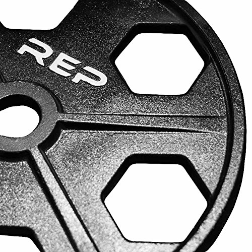 Studio : Rep Fitness Publisher : Rep Fitness Binding : Misc. Product Description Rep Equalizer Iron Olympic Plates Our highest quality iron Olympic plate, with extreme attention to detail. Save some money and purchase in either a 255 or 275 lb set! - Machine drilled center hole (not cast) for tight fit on bar.