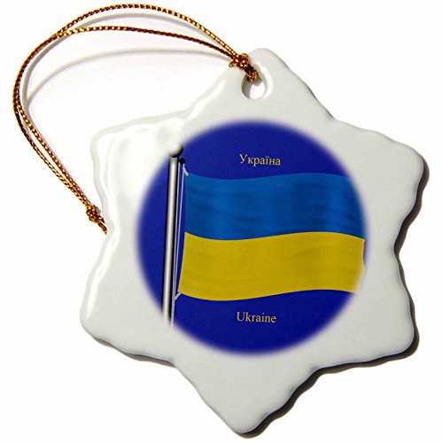 3dRose orn_63215_1 The Flag of The Ukraine on a Blue Background with Ukraine in English and Ukrainian Snowflake Decorative Hanging Ornament, Porcelain, 3-Inch