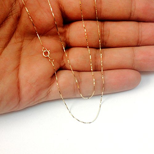 This 14k yellow gold box chain offers luminously polished facets and a silky smooth look. At a 0.45 mm thickness this chain is available in an 16" 18" and 20" length. Perfect for pendants and can also be worn alone. Includes a spring ring clasp to uphold strength and comfort.Feature